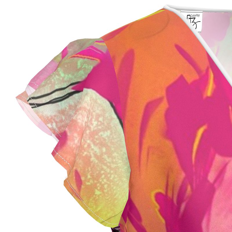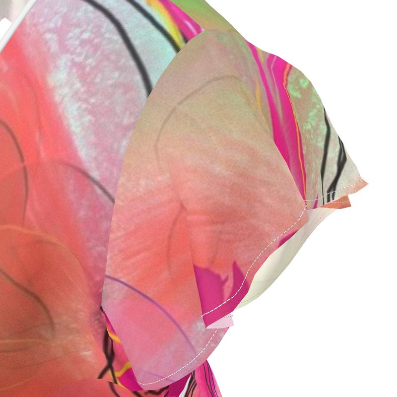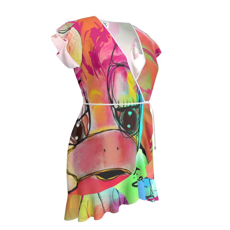 Der elegante Wickelschnitt mit Taillenband passt sich individuell deiner Figur an und sorgt für eine schmeichelhafte, feminine Silhouette. Die feinen Volants und die satinierte Einfassung verleihen dem Kleid eine besondere Leichtigkeit – perfekt für stilvolle Auftritte im Alltag oder zu besonderen Anlässen.